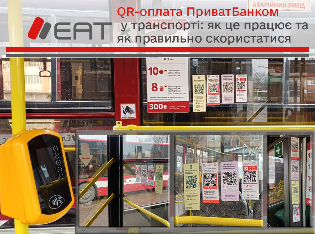 QR-коди розміщені в кожному автобусі та тролейбусі КП «Електроавтотранс» — біля дверей, на бокових вікнах та поруч із водієм. Ви побачите одразу 4 різні QR-коди від різних сервісів: Portmone, monobank, ПриватБанк та EasyPay. Усі вони працюють з банківськими картками будь-якого українського банку — достатньо мати доступ до інтернету.